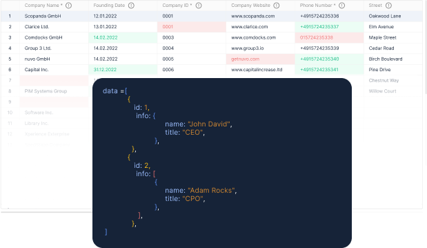 Multi-dimensional or grouped data (also called nested data) is something a lot of companies struggle with when importing and reformatting customer data. Breaking up these dimensions into a two-dimensional structure that can be displayed as a table takes up significant time and effort for engineering teams and is a key challenge our clients brought us.